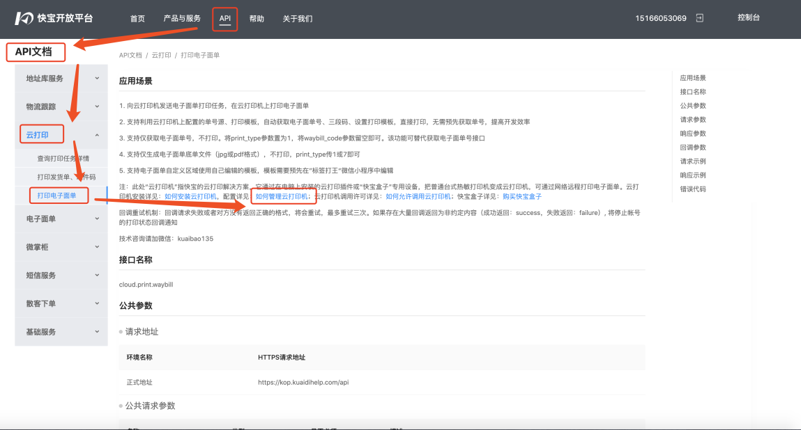3、进入API的接口文档、查看云打印》打印电子面单》。添加云打印机,相关内容查看快宝官方文档内容。